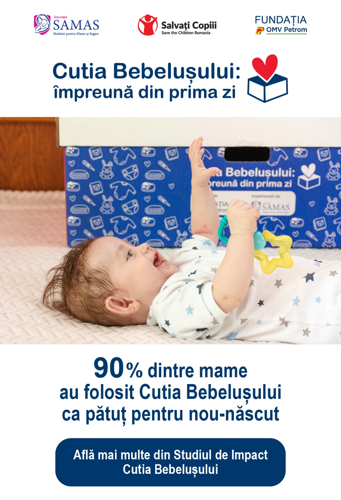 Inspirată din Finlanda, Cutia Bebelușului conține peste 60 de de produse esențiale pentru bebeluși și mame și poate fi folosită împreună cu pătura și salteaua ca loc sigur de dormit pentru cel mic în primele luni de viață ale acestuia. Programul include și o componentă educațională - sesiuni de instruire pe teme de puericultură și alăptare, educație pentru sănătate, și facilitează accesul la servicii medicale.
