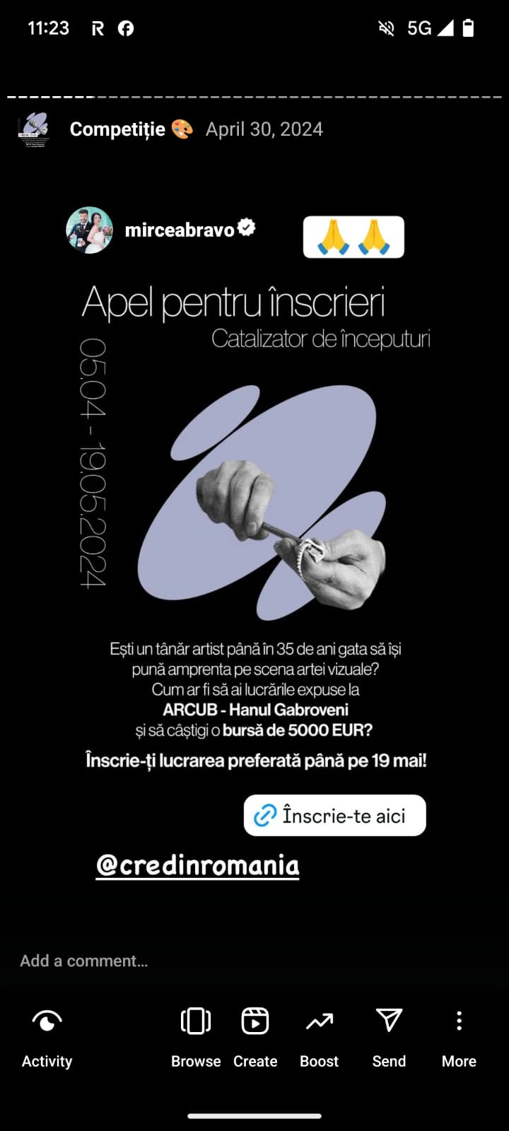 La această competiție s-au înscris un număr record de 320 de artiști. Iar pentru 50 dintre ei aleși de un juriu competent din domeniu, s-a organizat o expoziție unică, cu un mix de diverse forme de artă (pictură, sculptură, design grafic). Acești tineri artiști au fost expuși la ARCUB chiar după expoziția Dalí, câștigând astfel vizibilitate și notorietate. Lucrările tuturor celo 50 de astiști au fost prezentate și pe website-ul asociației Cred în România.